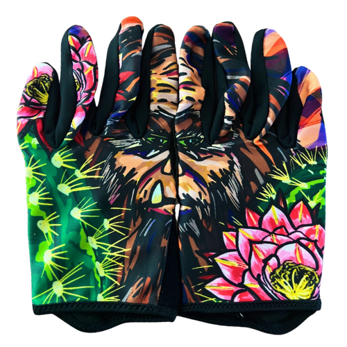 Designed by Patrick Hickey, this glove is a wild desert tribute to the legendary Sasquatch. Blending Arizona vibes with mythic energy, the design features a bold, hand-drawn Squatch peeking through blooming cactus flowers, backed by vibrant sunset cliffs. From the intense expression to the punchy colors, every detail screams personality and adventure.